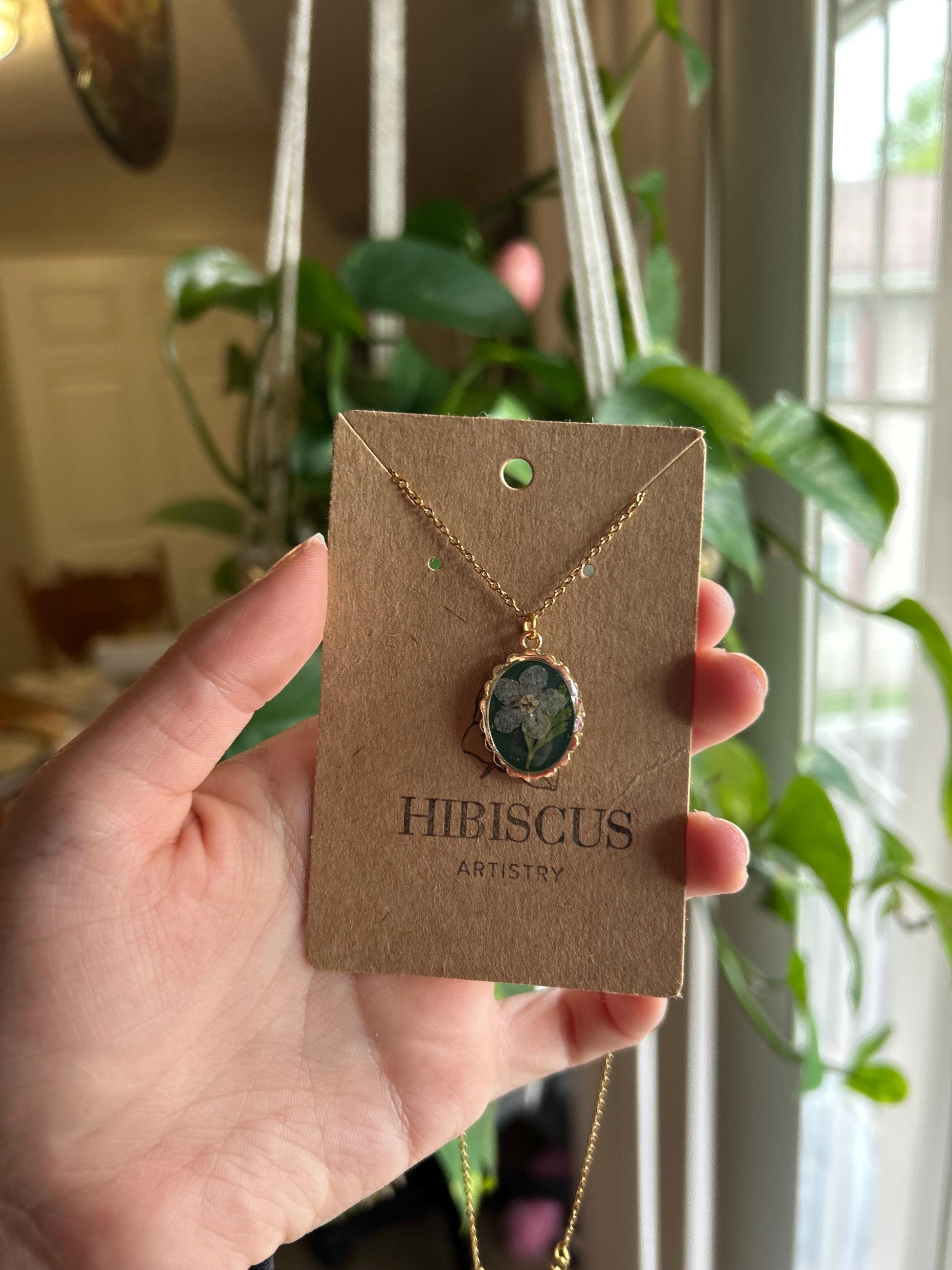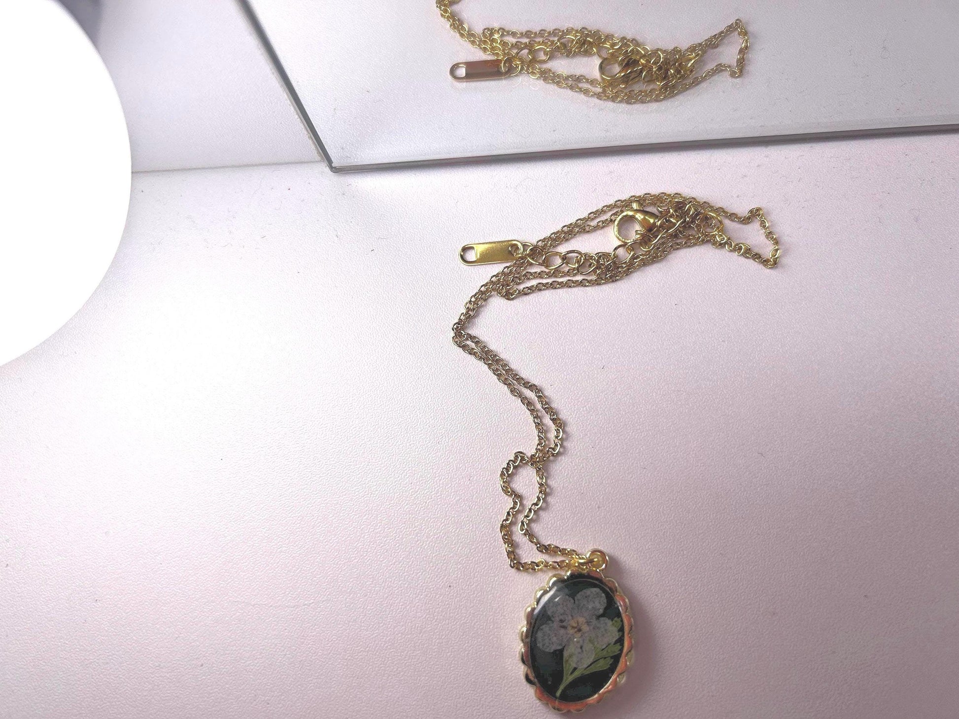 Resin Flower Necklace 18” Gold - Emerald Green Forget Me Not Necklace
