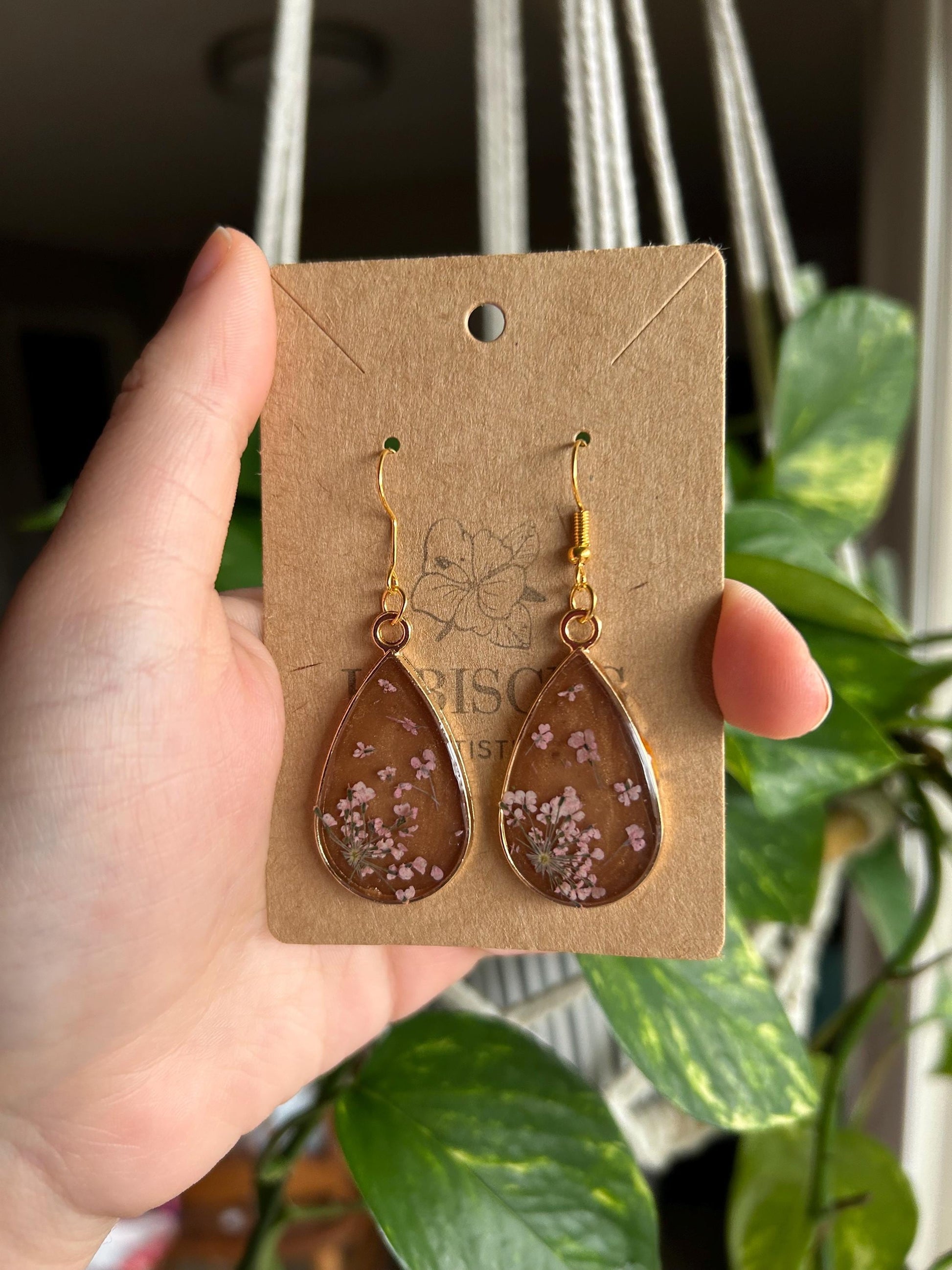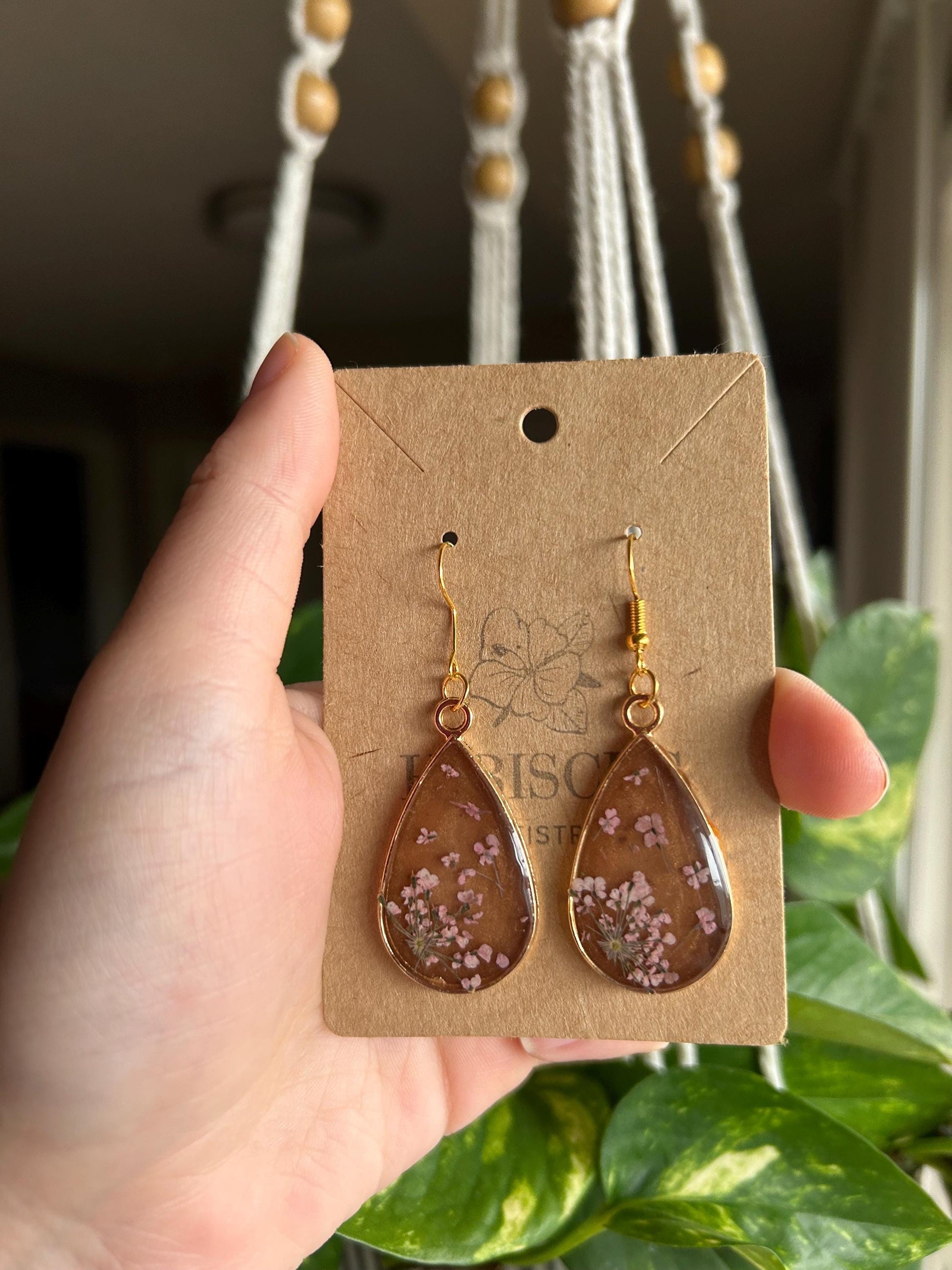 Brown teardrop shaped resin earrings made w/ pink lace flowers