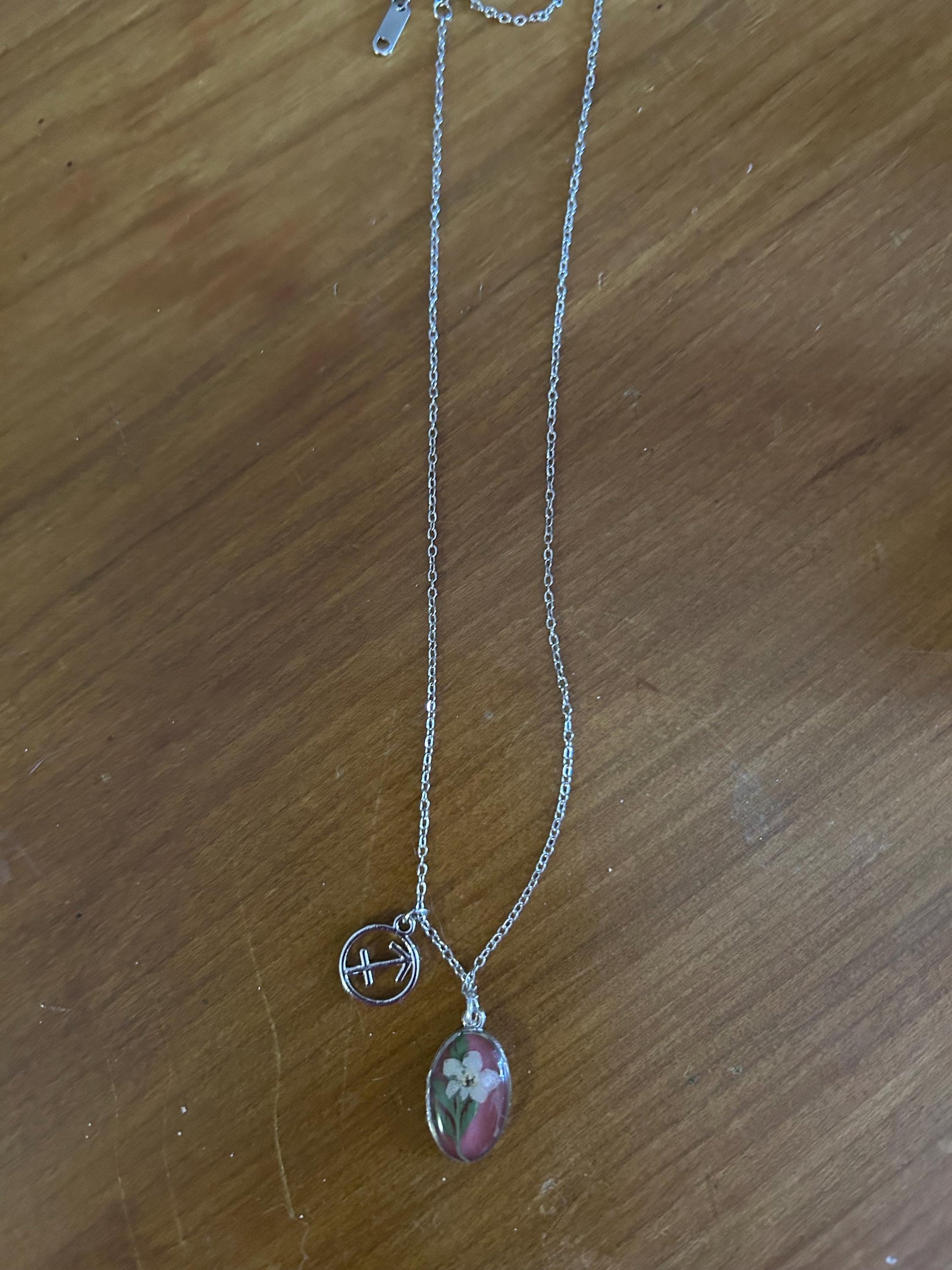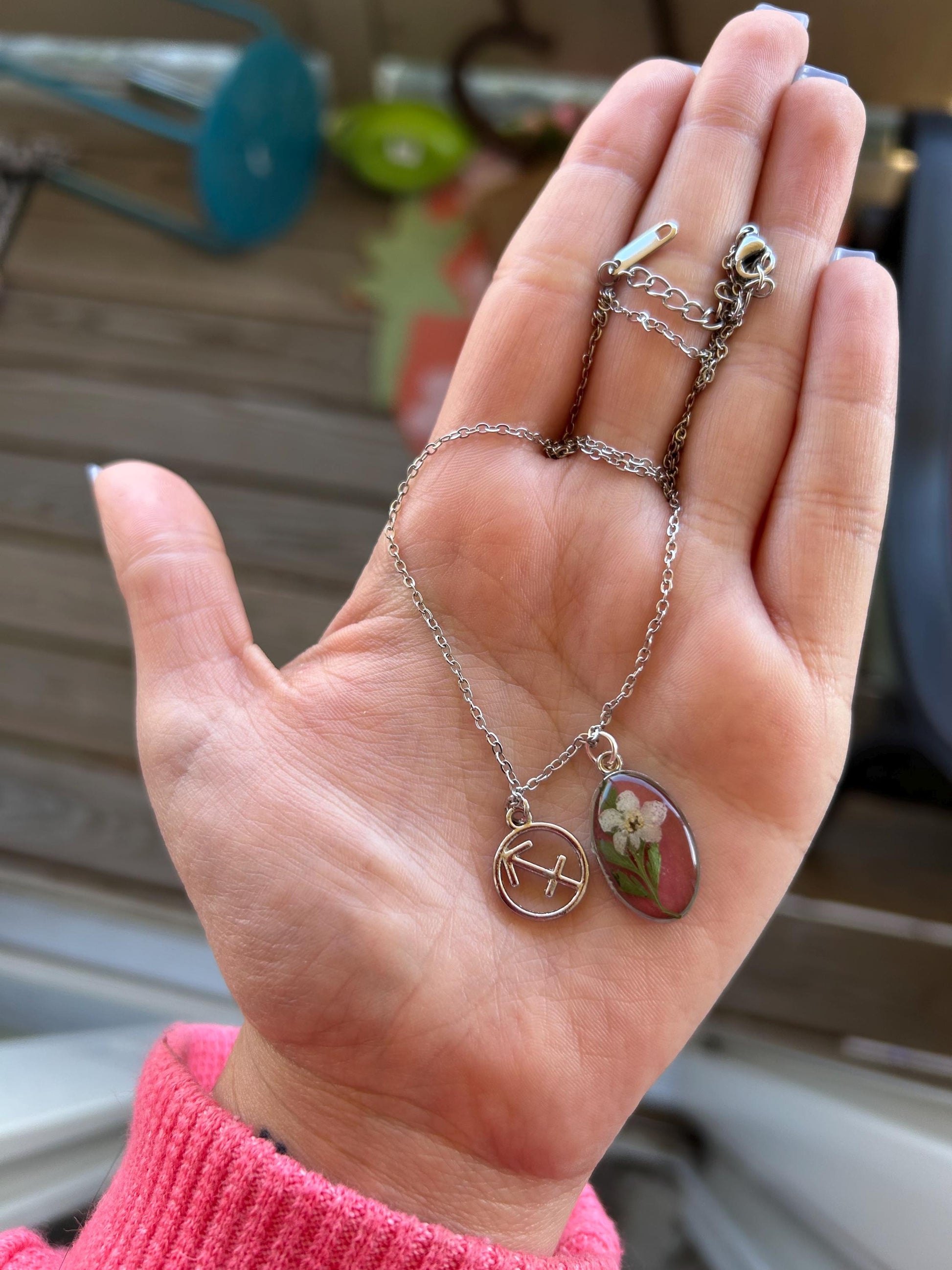 Zodiac Necklace 18” Silver Stainless Steel - Mauve & White Forget-Me-Nots